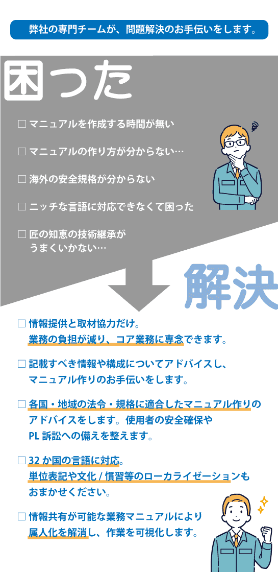 私たちは、単なるマニュアルの仕上げ屋ではありません。ご要望に応じて、製品の構造や業務内容までしっかりと理解し、お客様とともにわかりやすく、伝わりやすい情報を作成いたします。